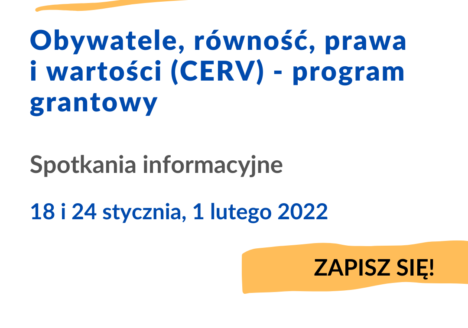 Zapraszamy na cykl spotkań informacyjnych o programie Obywatele, równość, prawa i wartości (CERV – Citizens, Equality, Rights and Values) – 18 stycznia (wtorek), 24 stycznia (poniedziałek) oraz 1 lutego (wtorek). Podczas tych wydarzeń…