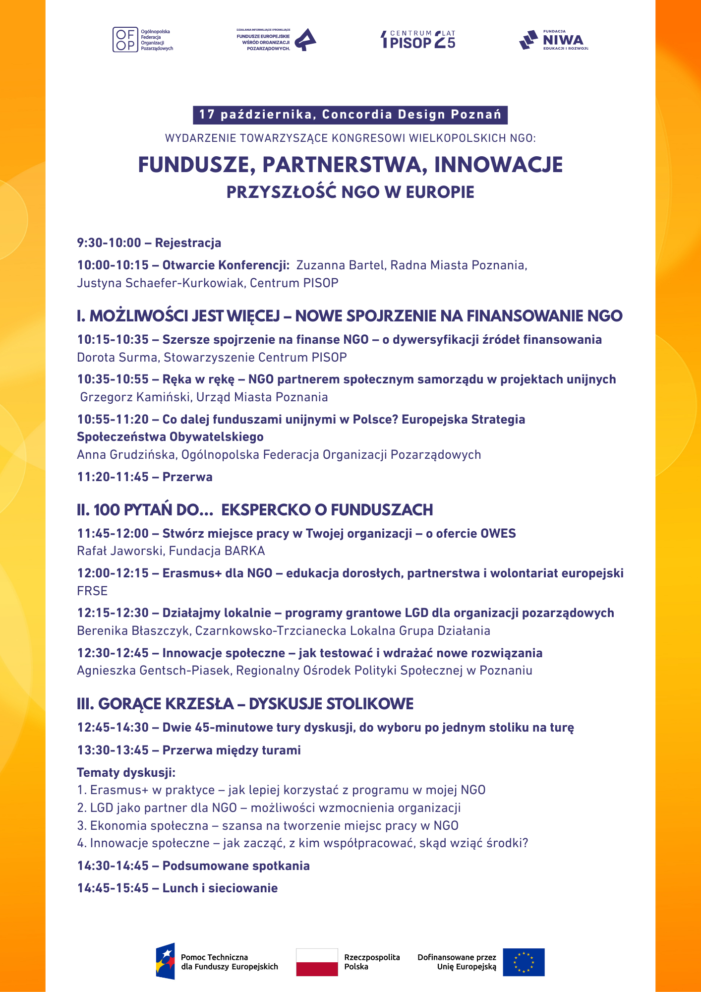 - Gorące krzesła – dyskusje stolikowe o praktycznych aspektach korzystania z funduszy